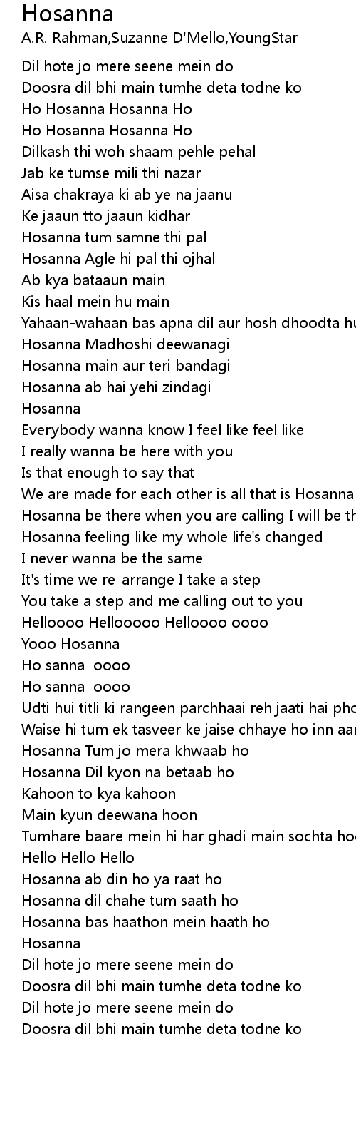 Hosanna from Hillsong Worship's upcoming project Take Heart (Again). Listen to Hillsong's latest here: hillsong.lnk.to/ytplaylist . Hosanna Lyrics are a topic that is being searched for and liked by netizens nowadays. You can Save the Hosanna Lyrics here. Get all royalty-free picture. Hosanna Ek Deewana Tha On Screen Lyrics HD YouTube, .